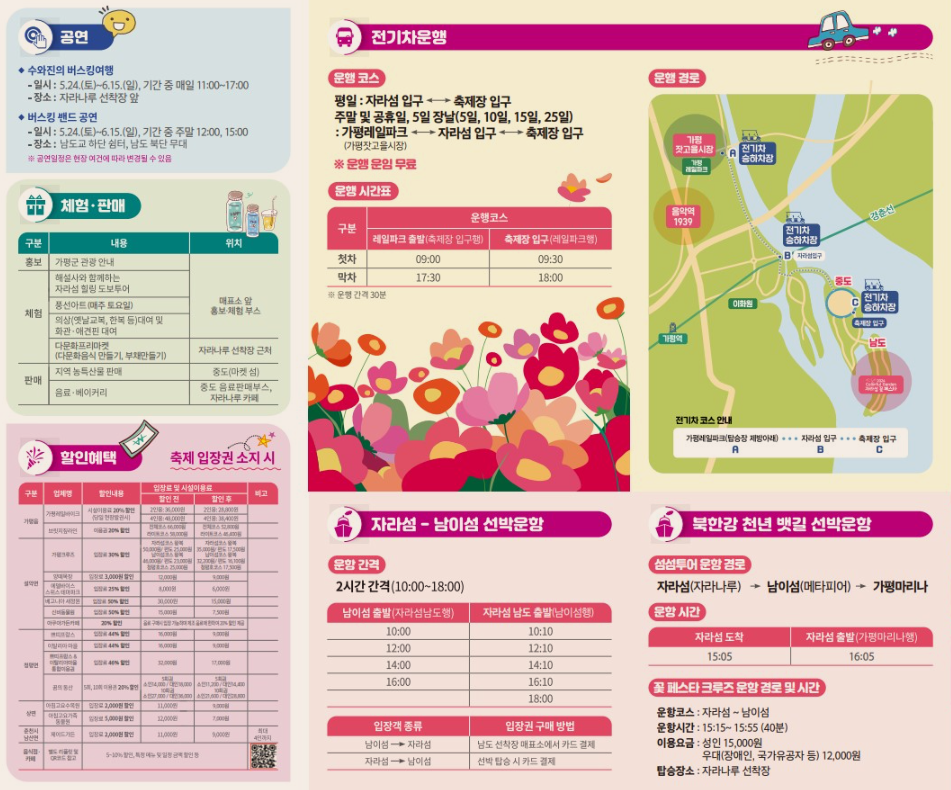 - 자가용: '자라섬 꽃축제 주차장' 검색, 주차 무료
